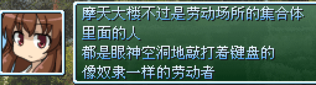 我确实有这种感觉。RM让他玩明白了,这个上帝视角的游戏制作器就要这么用。仿佛动画电影一般,却没有动画电影的巨大成本。仿佛GAL一般,却拥有GAL所没有的动作。仿佛小说一般,却省去了无数无用的描写。仿佛RPG一般,却拥有RPG没有的精致表情差分。